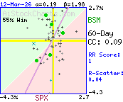 Correlation coefficient indicates very little or no strength in the correlation between SPX and BSM.