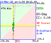Correlation coefficient indicates very little or no strength in the correlation between SPX and DRMA.